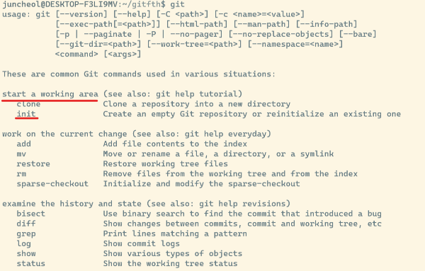 - git을 입력하면 명령어 및 도움말이 출력된다.