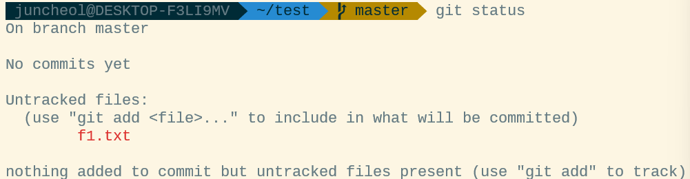 - 현재 f1.txt라는 파일은 버전 관리가 되고 있는 디렉토리인 'gitfth' 안에 존재하지만 git에게 해당 파일을 버전 관리하라고 명령하기 전 끼지 git 은 해당 파일을 무시한다.