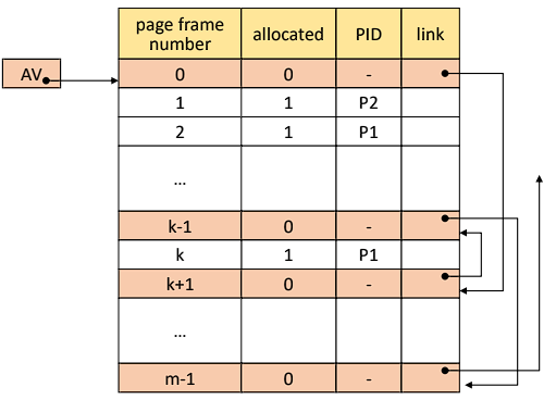- Page frame당 하나의 entry- 구성 : Allocated/available field PID fieldLink field(For free list, 사용가능 한 fp들을 연결)AV(Free list header, free list의 시작점)