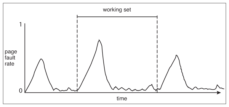 지역성의 원리는 시간상의 어느 시점에서라도 이들이 동작 집합working set 또는 거주 집합resident set이라고 알려진 보다 작은 활성화된 페이지 집합에서 동작하는 경향을 보일 것이라는 점을 약속한다.