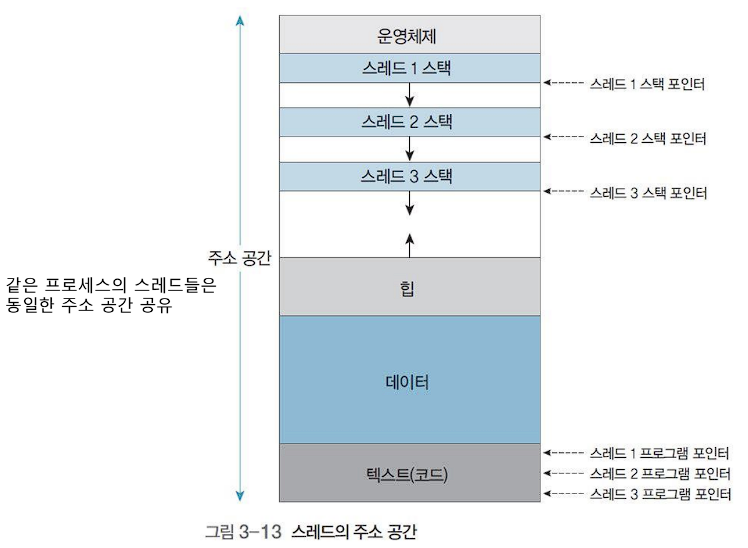제어 요소 외 코드, 데이터 및 자원들은 프로세스 내 다른 스레드들과 공유
