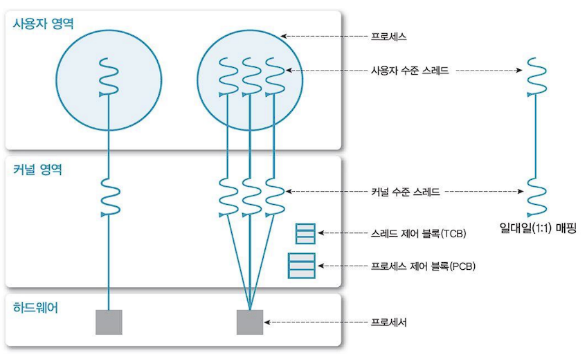 - 커널 스레드는 자신에게 할당된 하나의 사용자 스레드가 block 상태가 되어도, 다른 스레드 수행 가능.