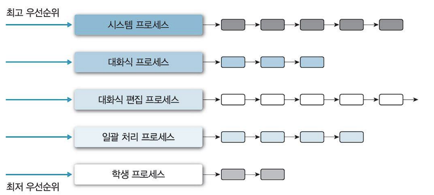 작업 (or 우선순위)별 별도의 ready queue를 가짐