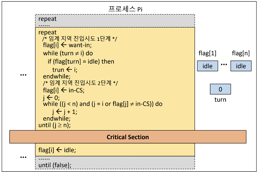 - 최초의 프로세스 n개의 상호 배제 문제를 소프트웨어적으로 해결