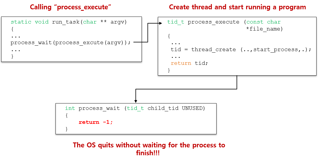 3. 여기서 주목할 점은 처음 호출되는 run_task(char **argv)에서 프로세스 실행 함수를 인자로 받는 process_wait(tid_t child_tid UNUSED) 함수이다. 이 함수는 기본적으로 -1을 return 하고 해당 함수가 하는 역할을 인자로 사용되는 process_excute함수가 끝날 때까지 기다리는 것이다.