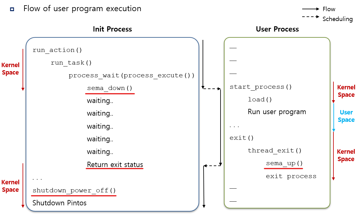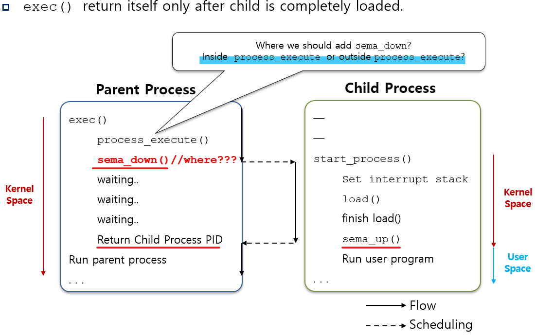 3. sema_down을 호출하여 하위 프로세스의 실행 파일이 성공적으로 로드될 때까지 기다린다.