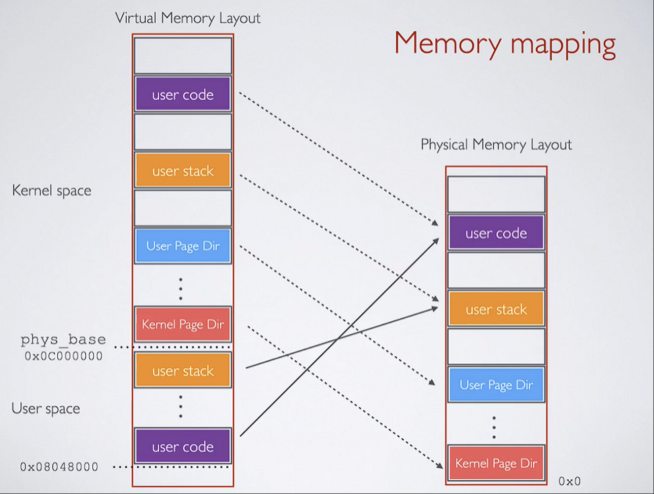 예를 들어, User space의 user stack에 stack을 할당할 때 USER_STACK주소로 user stack에 접근할 수 있다. 하지만, system call을 호출을 수행할 때 커널 공간에서 동일한 사용자 스택에 접근할 수 있다.