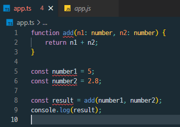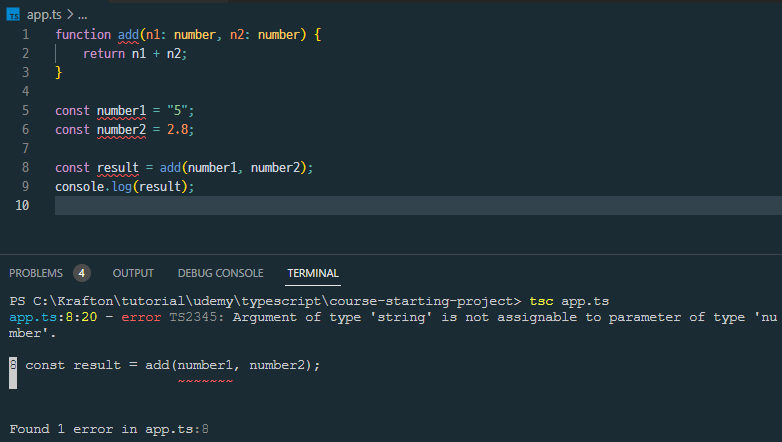 위와 같은 함수를 호출한 경우 tsc app.ts 를 터미널에서 호출하여 .js 파일로 컴파일 시키면 아무런 문제없이 7.8이 찍힌다. 하지만 number1 에 string 데이터타입인 '5'를 입력하면 어떻게 될까. 52.8이 출력될 것이다.