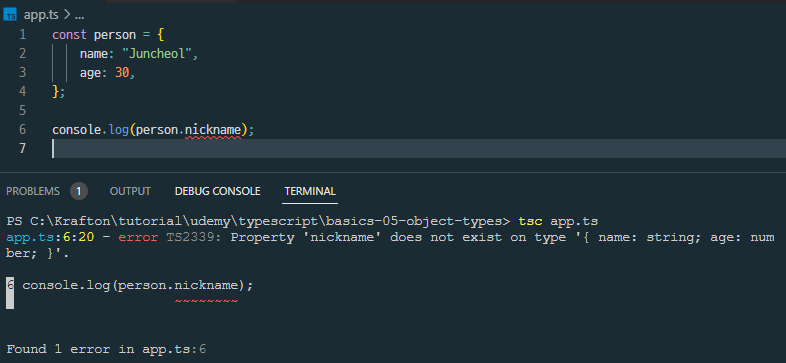 이 상태로 코드를 작성하게 되면 타입스크립트는 person이 object타입인 것만 알게된다. 즉, 어떤 key값과 type을 가지는지 전혀 추론할 수 없다. 이런 식으로 코드를 작성하기 위해서 다음과 같이 추가적인 작업을 할 수 있다.