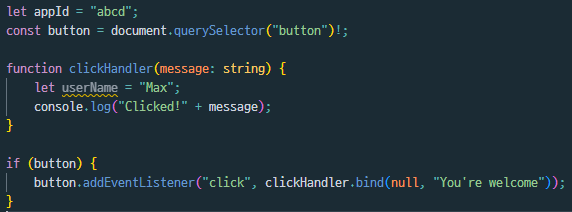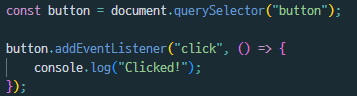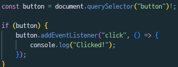 우리가 dom객체를 찾는 함수에 느낌표를 붙이는 것은 해당 값이 꼭 있거나, Null이 아니라는 것을 명시하는 것이다. 또한, 더욱 정확한 구동일 위해서 button.addEventListener 구문을 if문 안에 넣어서 런타임 중에도 체크하게 만든다.