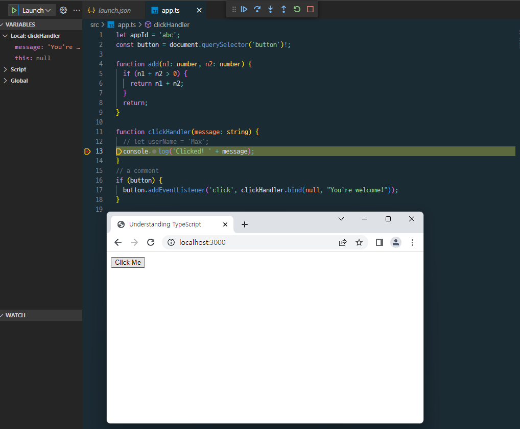 F5를 눌러 디버깅을 시작하면 localhost:3000의 서버가 열릴 것이다. 이제 디버깅 해보자. app.ts의 clickHandler의 console.log 구문에 중단점을 설정하고 버튼을 클릭하면 다음과 같이 코드가 일시중지 될 것이다.