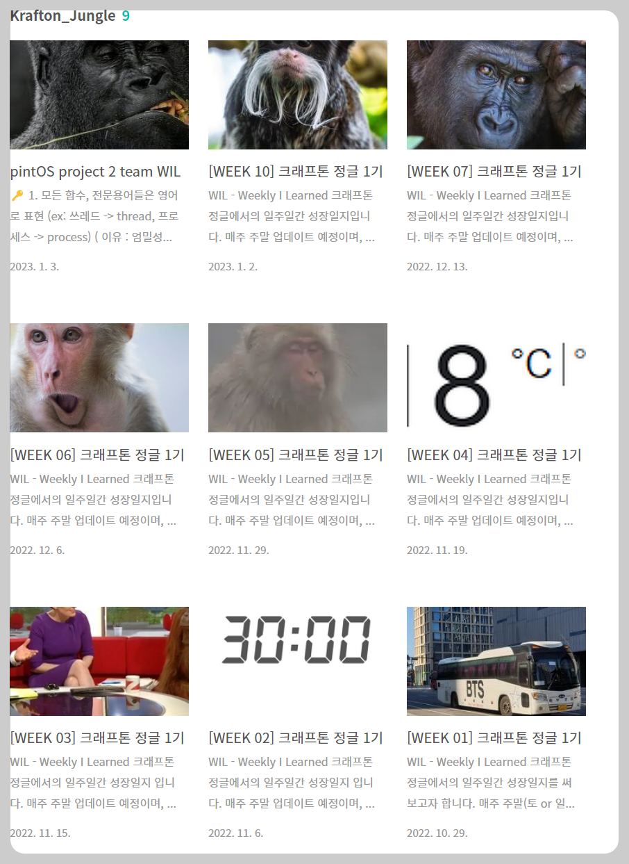 | [WEEK 06] 크래프톤 정글 1기 (1) | 2022.12.06 |